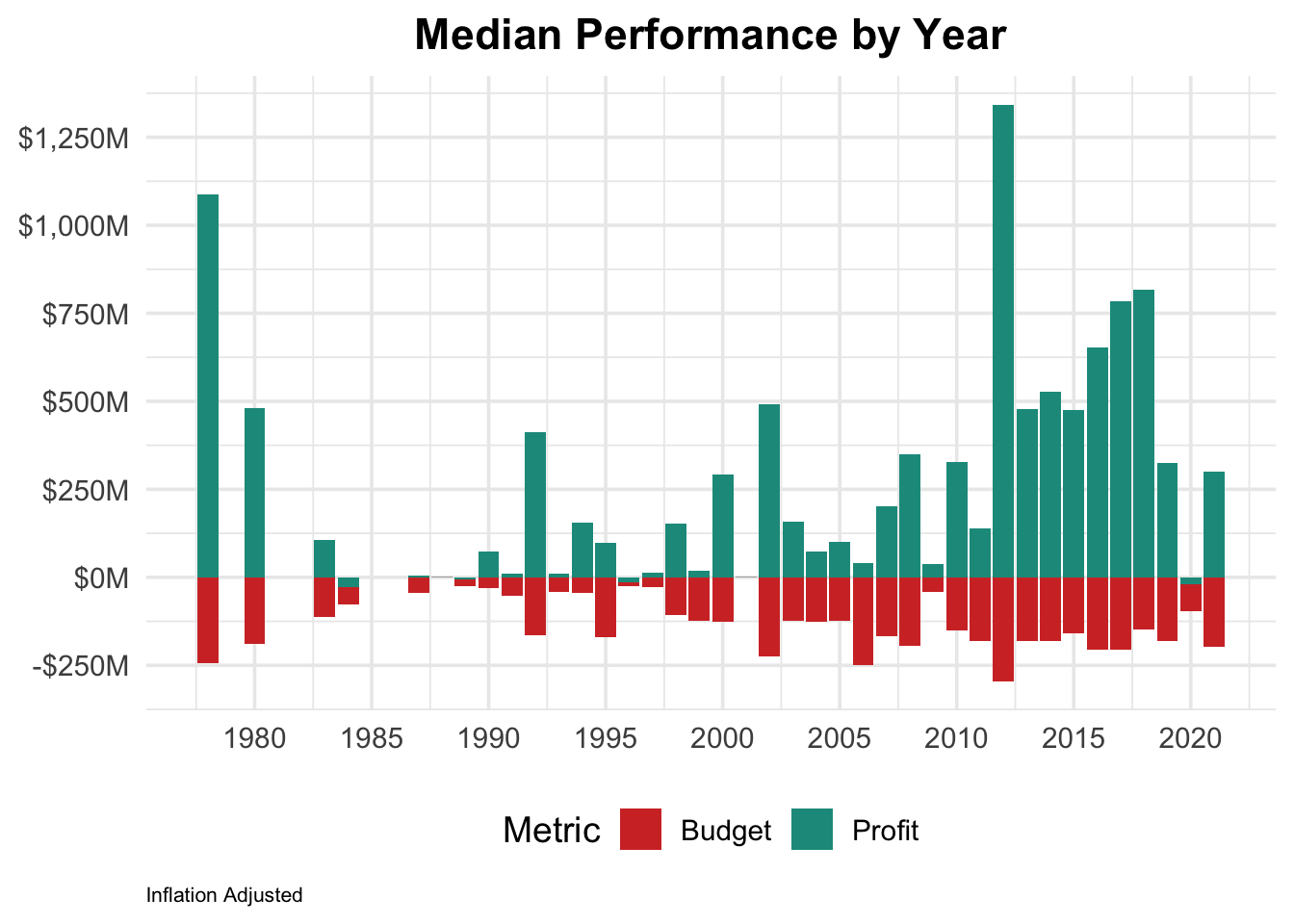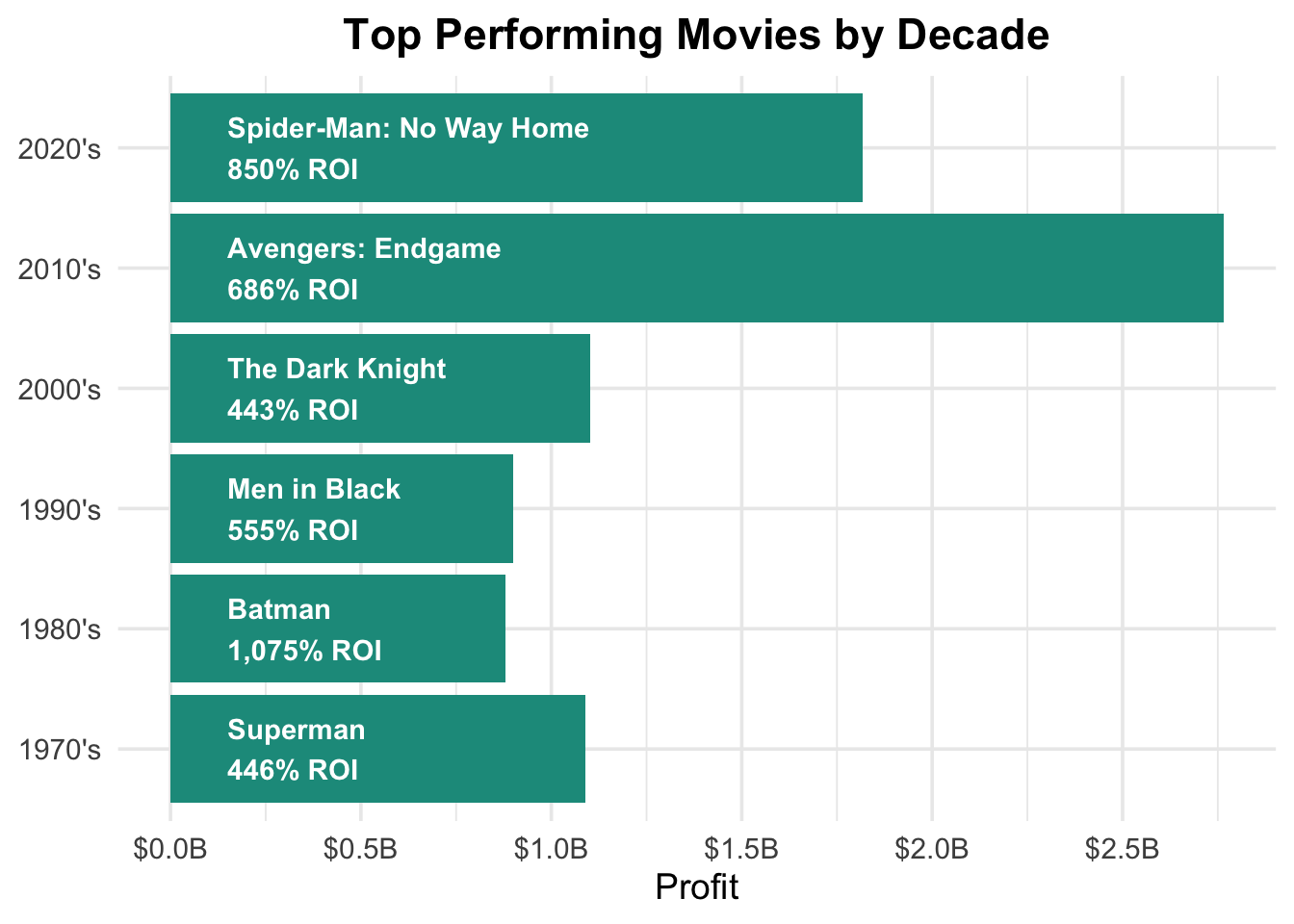 This plot is pretty interesting. Avengers: Endgame is by far the greatest superhero success at the box office, but 1989’s Batman offered investors a higher rate of return at a whopping 1,075% ROI.